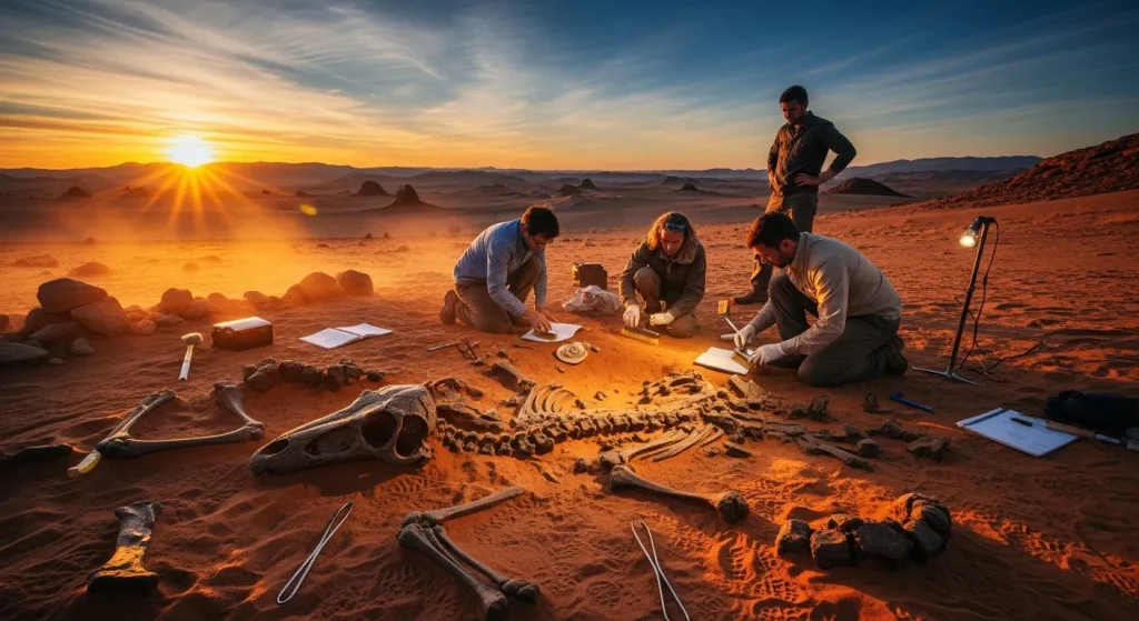 風化した砂岩の中から、数十体のアヴィミムスの骨が一度に見つかった。