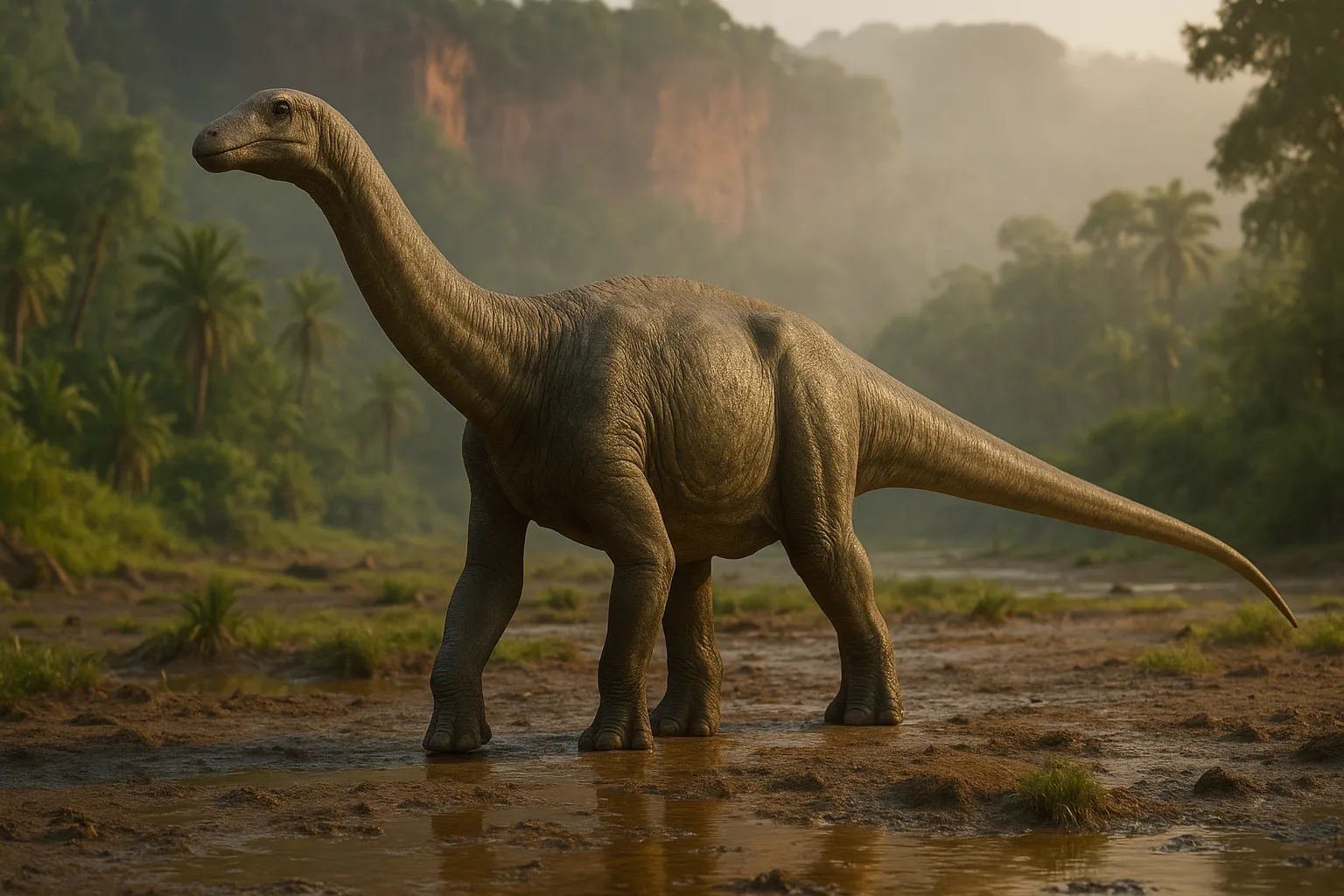 約1億2千万年前――今のタイ北東部は、緑濃い平原と川が複雑に絡み合う、命あふれる世界でした。湿った空気の中を、巨大な影がゆっくりと動きます。大地を震わせながら歩くその姿こそ、プウィアンゴサウルス(Phuwiangosaurus)。アジアの地に生きた、優雅で逞しい竜脚類の一種です。