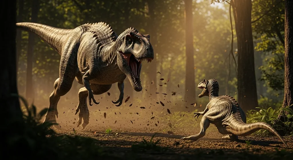 密林の影に身を潜め、草食恐竜や小型獣脚類が近づくのをじっと待つ。そして、隙を突いて一気に襲いかかり、鋭い歯で肉を切り裂く――その狩りはまるでジャガーのように静かで、確実だったと考えられます。