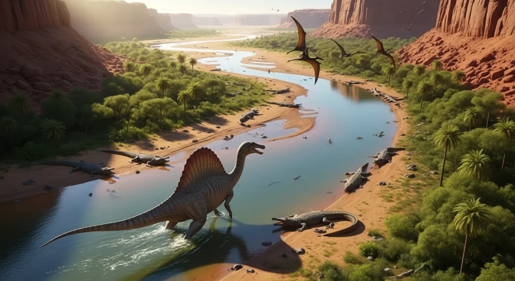 そこでは魚が群れ、ワニの祖先が潜み、巨大な捕食者たちが水辺を支配していた。