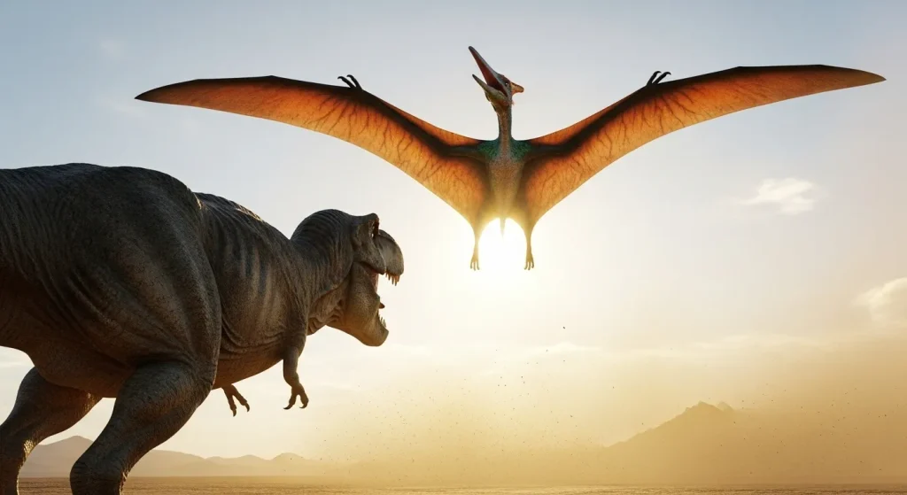 直接的な戦闘は成立しません。ケツァルコアトルスが真に強いのは、「戦わずして支配できる」点にあります。空からの索敵と移動により、T. rex の支配圏を自由に越え、食糧と縄張りを選べたのです。もし彼らが対峙したとしても、ケツァルコアトルスは一撃離脱を選び、重力から解放された存在として優位を保ったでしょう。