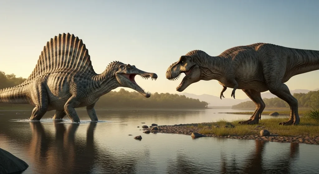 - 感覚・行動:T. rex は嗅覚・視覚の統合で大型獣の仕留めに適応。スピノは水辺の待ち伏せや水中追尾など、生息域の特化で優位を得る。